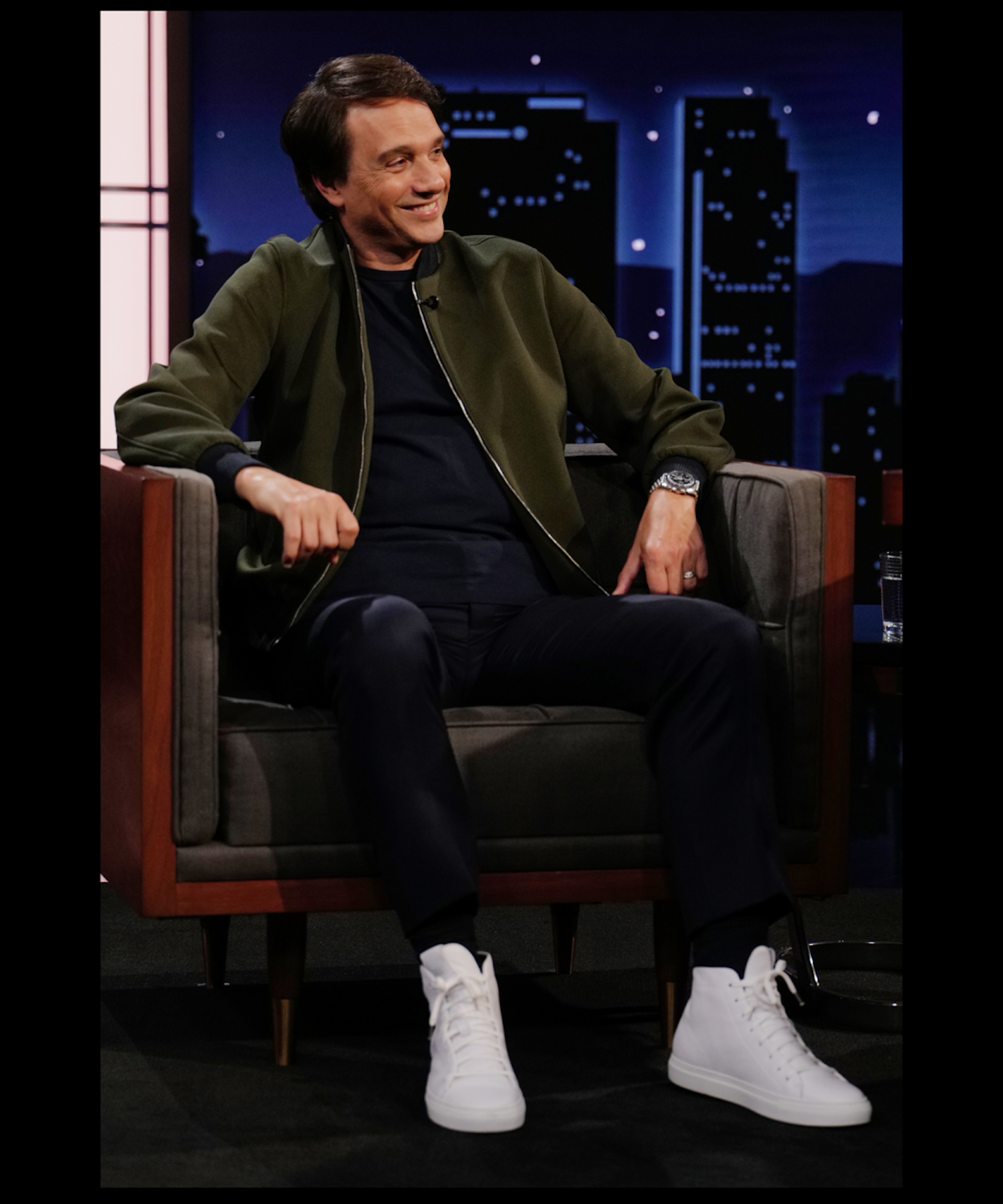 Ralph Macchio, in the Ray high tops, telling Kimmel about being stalked by Coldplay’s Chris Martin.